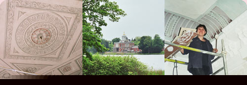 Konservierung und Restaurierung einer grisaillebemalten Decke in der Kammer „En Camaieu“ im Hauptbau, Dokumentation Konservierung, Restaurierung und Rekonstruktion der illusionistischen Vouten- und Gesimsfassung im „Kloeber-Saal“ sowie des Alkoven im Nordflügel, Dokumentation |